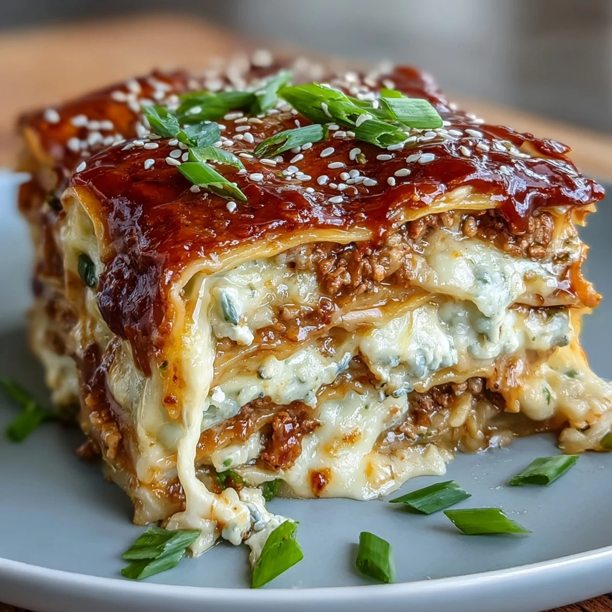 Pin it A vibrant fusion dish that layers tender dumpling wrappers, savory ground meat, crisp vegetables, and rich cheese, all topped with a zesty soy ginger sauce. This recipe offers a playful twist on classic lasagna with irresistible Asian flavors, creating a meal that is as exciting as it is comforting.