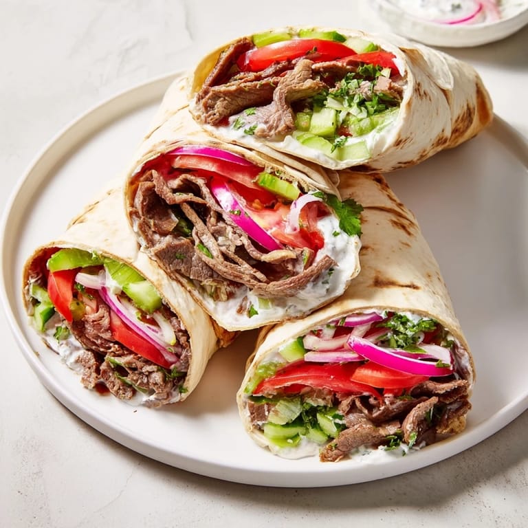 Pin it Tender spiced beef strips wrapped in warm flatbread with fresh vegetables and a tangy creamy yogurt sauce a Middle Eastern street food classic.
