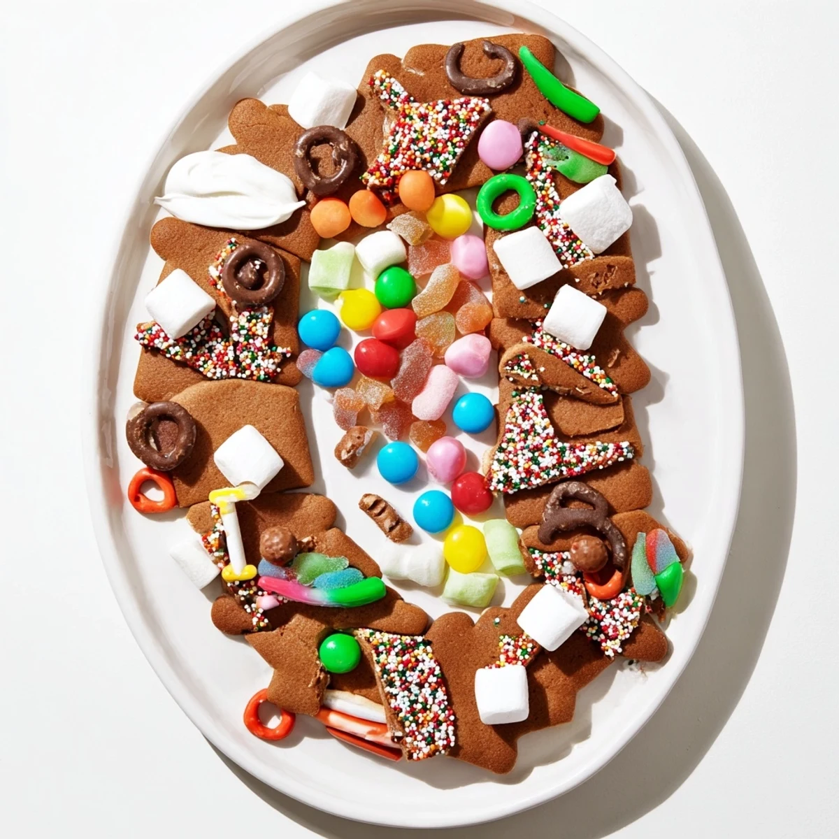The colorful mix of candies, sprinkles, and varied treats arranged with the gingerbread path creates a visually joyful presentation reminiscent of a playful game board.