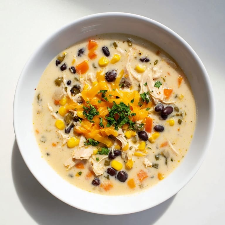 Pin it A creamy and comforting soup featuring shredded chicken, smoky poblano peppers, black beans, sweet corn, and a touch of lime—perfect for cozy dinners and quick weeknight meals.