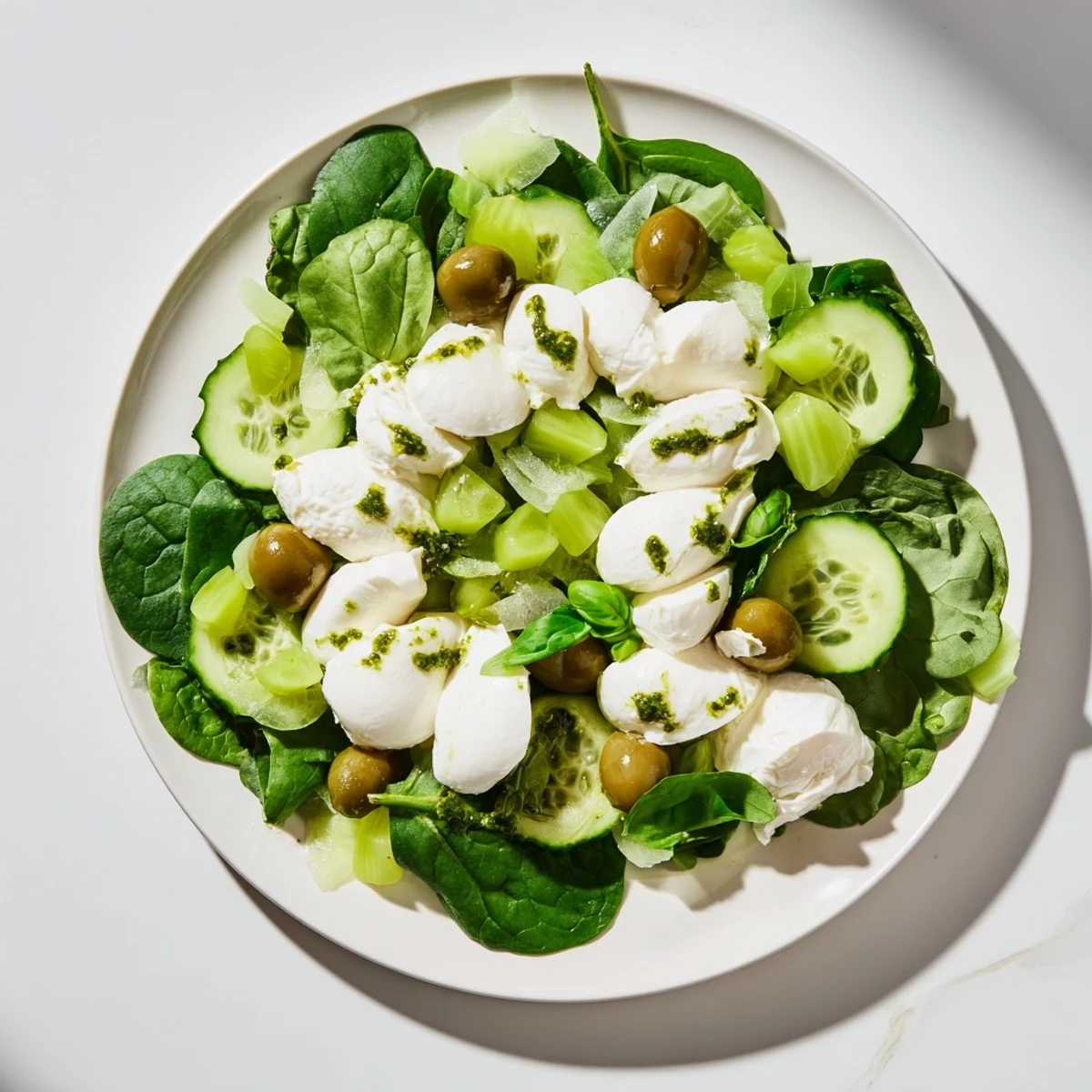 One of the revelations in creating this salad is understanding that 'green' is not one color—it's dozens. The pale, almost translucent green of cucumber, the deep forest of spinach, the bright lime of kiwi, the murky olive of the olives, the soft sage of basil. When you arrange these consciously, you're not just making salad; you're creating depth and visual interest. Your eye travels across the plate, finding new colors, new textures. This is why presentation matters—it enhances the actual eating experience.
