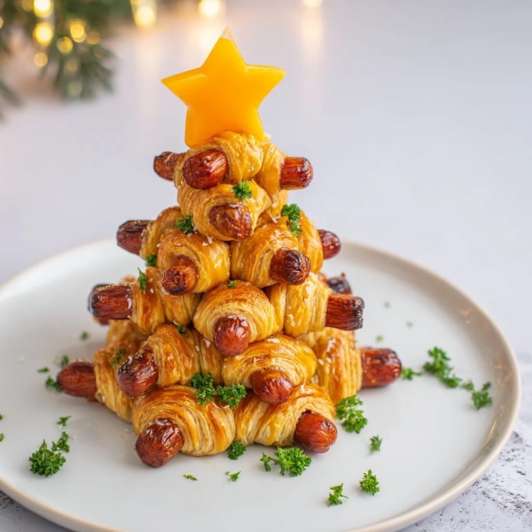 Pin it A festive, fun, and speedy appetizer featuring mini sausages wrapped in golden puff pastry arranged in a charming Christmas tree shape—perfect for holiday gatherings.