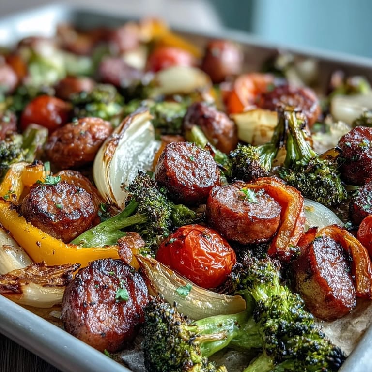 Pin it My kids came home from school talking about a rainbow they'd seen that morning, and I realized our dinners had become pretty monochromatic lately. That evening, I raided the vegetable drawer with this wild idea of making the plate as colorful as the sky they'd described, then threw in some sausage to make it substantial enough that nobody could claim they were still hungry an hour later. The oven did most of the work while I pretended I'd planned this all along.