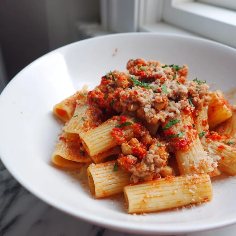 Pin it A bold, flavor-packed pasta dish featuring a fiery arrabbiata sauce and crispy roasted chickpeas for an irresistible crunch.