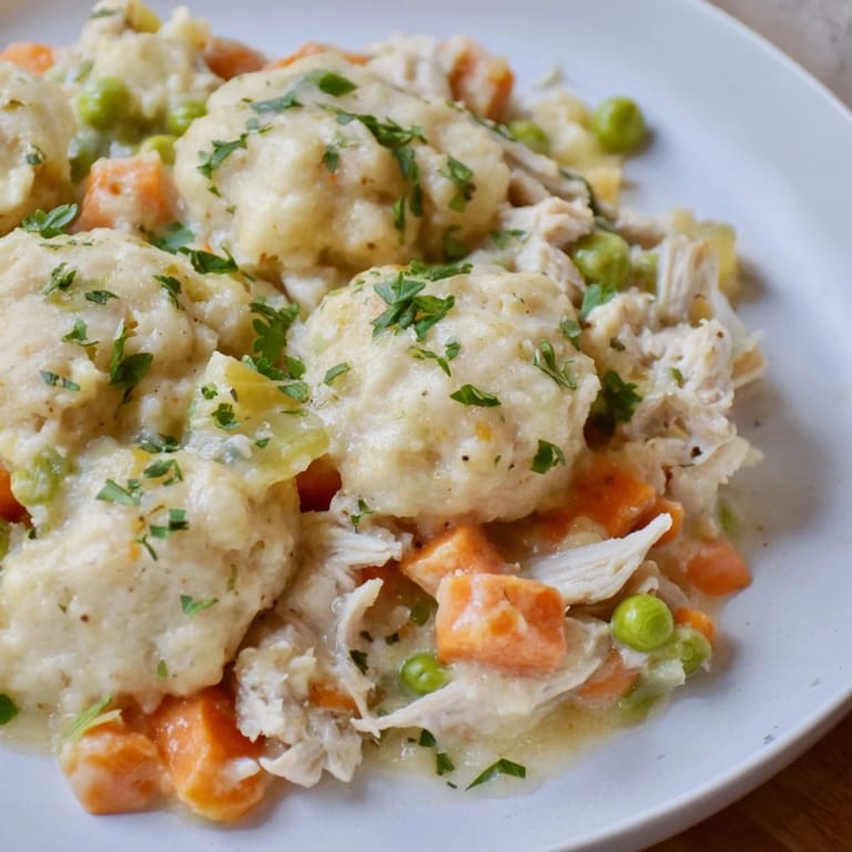 Pin it A comforting, hearty casserole combining tender chicken, vegetables, and fluffy dumplings baked in a creamy, savory sauce.