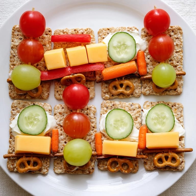 Line up whole-grain crackers as cars, attaching cucumber slices with cream cheese or hummus as wheels, and insert pretzel sticks underneath for axles.