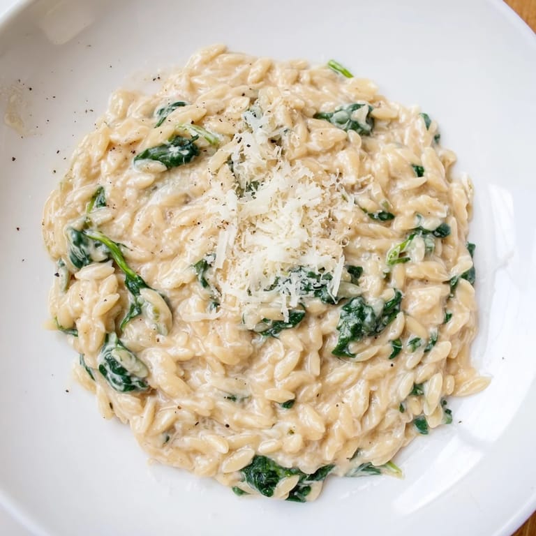 Orzo is a bridge between pasta and risotto, soaking up sauce while staying tender rather than swimming in it. The spinach adds vitamins and color without announcing itself, and the Parmesan gives you that umami note that makes you take another bite. You could add chicken or mushrooms if you want protein that wasn't already accounted for, but honestly, the cheese and cream do enough lifting that this is satisfying as written.