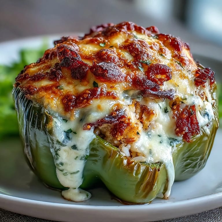 Pin it My neighbor stopped by one Tuesday evening with four beautiful bell peppers from her garden, and I found myself staring at them on my counter wondering what to do with something so perfect. That's when it hit me—why not stuff them with something that actually tastes like comfort, not just an obligatory vegetable vessel? I rummaged through my fridge, found some leftover rotisserie chicken, and started building a filling that felt almost indulgent with cream and Parmesan. The house smelled incredible within minutes, and by the time they came out of the oven golden and bubbling, my neighbor was already asking for the recipe.