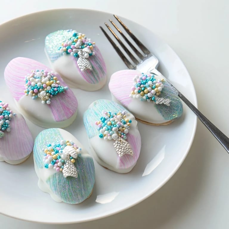 Pin it Delicate, mermaid tail-inspired petits fours featuring colorful, airy madeleines with a hint of vanilla, dipped in white chocolate and adorned with shimmering sprinkles — perfect for refined afternoon teas or festive celebrations.