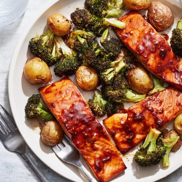 Broccoli and baby potatoes roast evenly with salmon, soaking up flavorful juices and glaze.